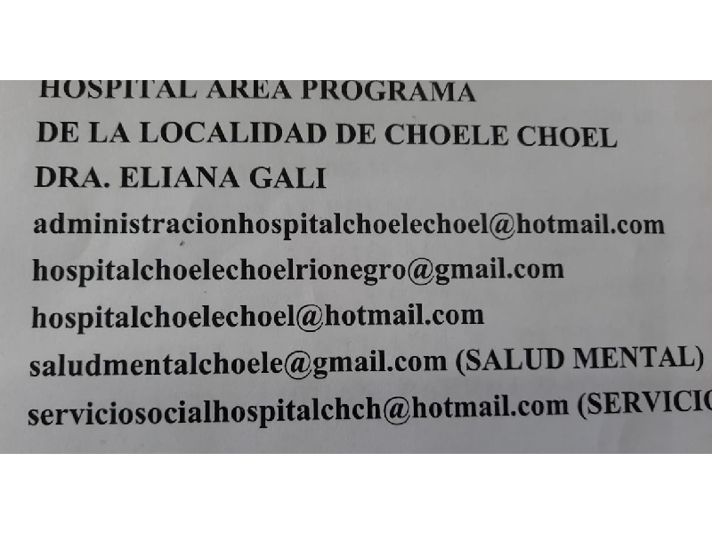 Hospital Area Programa “CHOELE CHOEL" Tel/Fax: 02946-442219 / 443139/ 443159 Centrex: 5127Dirección postal: Avenida San Martín 1319 (CP: 8360 - Choele Choel) Mail SSM:saludmentalchoele@gmail.comComplejidad: IV